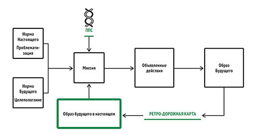 5|Д Пятый этап. Перевод образа будущего в настоящее через «ретро-дорожную карту», под которой понимают оперативный или стратегический план действий. Но дорожная карта – это схема существующих и возможных дорог, а не движение по ним. Поэтому нередко план, при появлении случайного или внезапного события («черного лебедя»), начинает рушиться, а на дорожной карте появляется новый элемент, учитывая который, при движении группа выигрывает. Ретро-дорожная карта строится от образа будущего до настоящего как реконструкция сценария. Например, если в таком-то году нужно что-то построить, в предыдущий год надо это спроектировать, до этого запланировать и т. д.