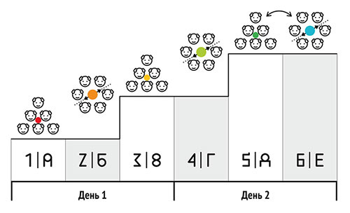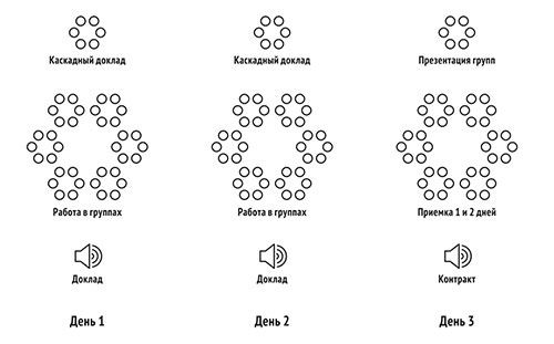 Первый день носит окраску «проблемности», второй – «проектности», а третий – «согласованности». Каждый сессионный день состоит из трех частей: установка, групповая работа и итоговая сборка в формате смотра (демонстрации/обсуждения) выработанных в группах инициатив (см. главу 5).