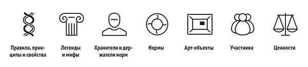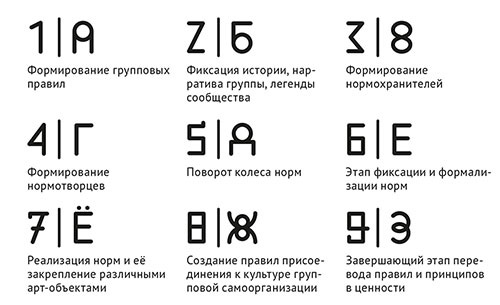 7|Ё Реализация норм и ее закрепление различными ритуалами и арт-объектами. Участники формируют атрибутику культуры оргструктуры и группы, поддерживающую ее процессы внутри сообщества и позволяющую транслировать ее вовне.