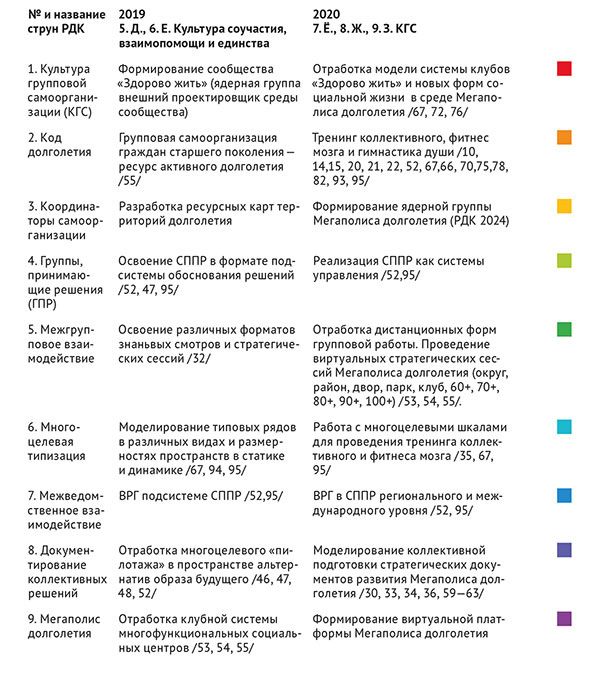 Образ будущего приводится в настоящее через ретро-дорожную карту (5.Д.), усиливает заявленные действия по преобразованию ОДП в общегородскую среду долголетия (6.Е.), порождает базовую идею «Социальные коммуникации – основной ресурс активного долголетия» (7.Ё.), которая распространяется через идеологему «Жить – здорово!» социальными координаторами в формате «пространственный тренинг коллективного и фитнес мозга» (8.Ж.) и реализуется в социально-психологическом пространстве Мегаполиса долголетия (9. З.).