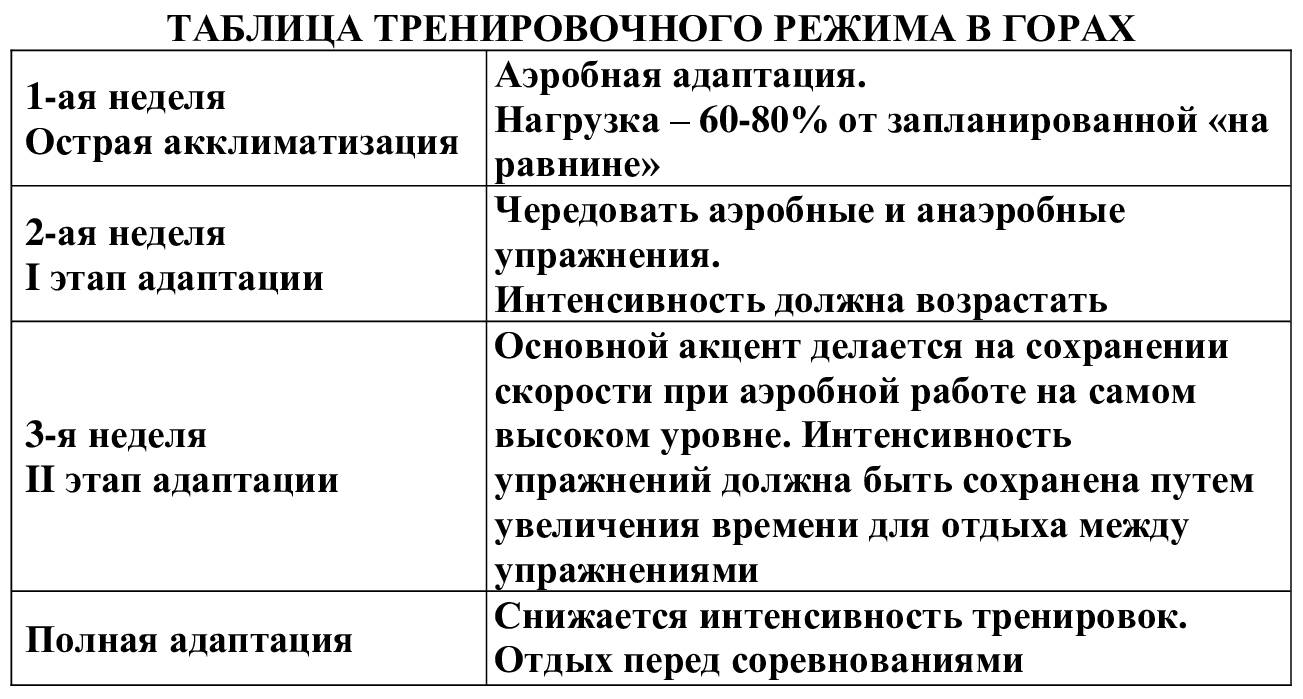 Молодые спортсмены без горного стажа в процессе адаптации более сильно реагируют на тренировочные нагрузки, что удлиняет сроки «острой» акклиматизации. Благоприятно влияют на адаптацию горный стаж и степень подготовленности спортсмена.
