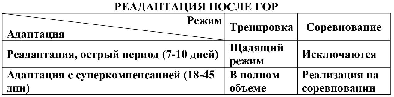 При возвращении на равнину первые 7 дней, «острый период», идет процесс реадаптации с ухудшением спортивных результатов и риском возникновения заболеваний (особенно 3-4-й дни); далее следует подъем работоспособности. Пик результативности (индивидуален по срокам) возможен с 18 по 30-й день.