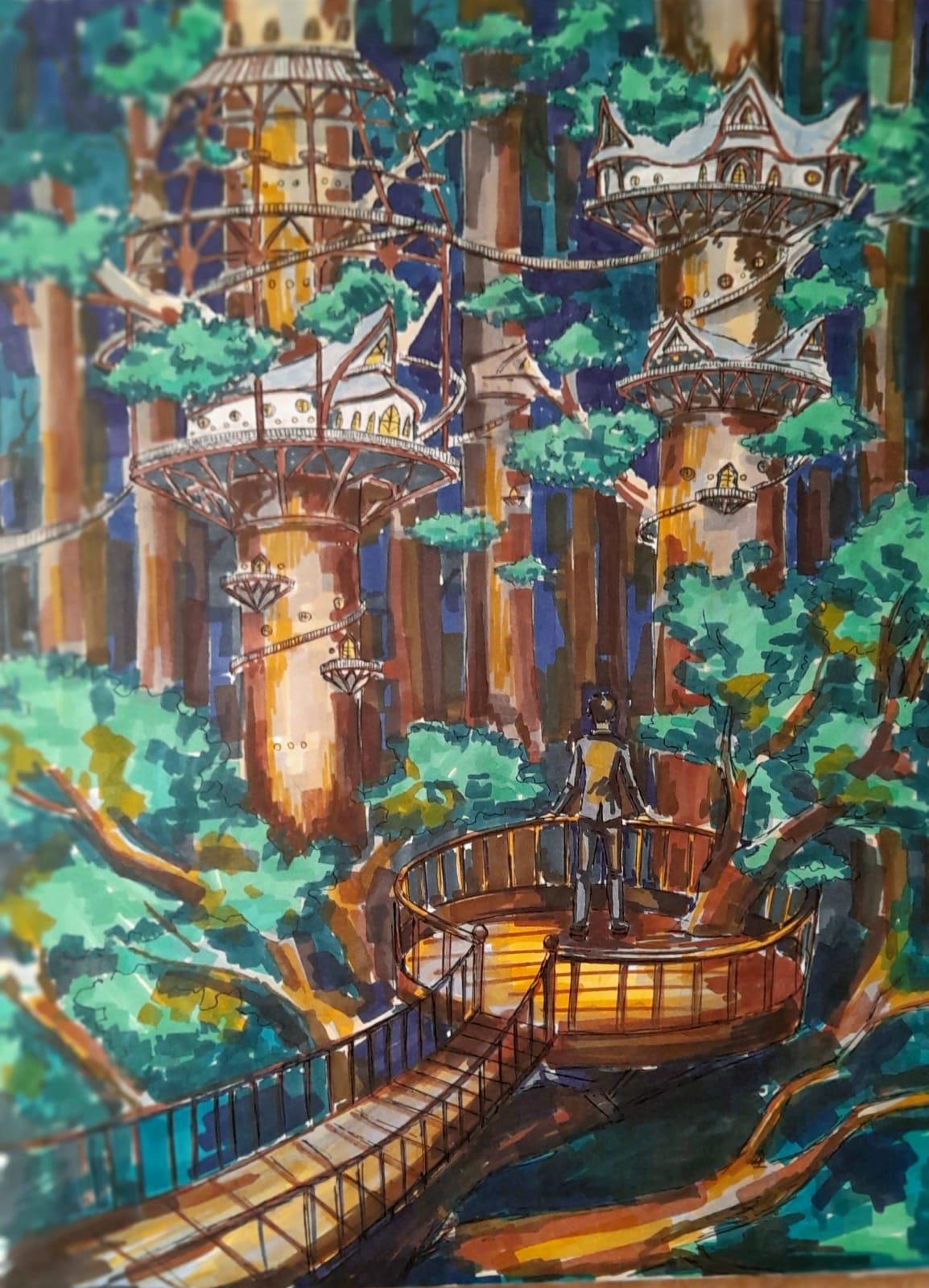 А я что, я и пошёл, что бы сразу остановиться на первом же мостике. Когда нас Дедом Львом вели по деревне, мы оказывается шли по центральным проспектам – широким мостам, сплетённым из толстых канатов с деревянным настилом и высокими поручнями, дающими ощущение защиты перед высотой. Я же остановился перед узеньким мостком который, мало того, что не имел поручней для страховки, так и похож был скорее на паутинную дорожку. Вот по этой дорожке ко мне и подбежали два знакомых сорванца, любителя чащоб и ночных охотниц. А мне предельно ясно стало почему восьминоги живут на деревьях.