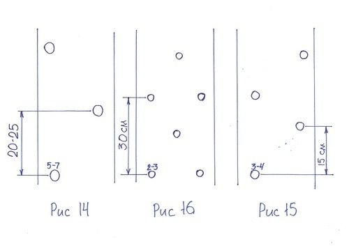 Вариант 1. Вершины высаживаем как целые клубни – 20-25 см по грядке с небольшим смещением (см. рис.14).