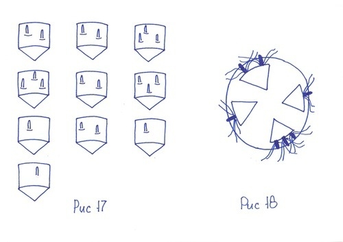 Помня о конкурентной борьбе и особой важности начального этапа развития картофельного растения, стоит иметь в виду, что чем дальше друг от друга находятся активные ростки при посадке – тем лучше. Именно поэтому среди вариантов посадки, которые я использую (см. рис.14-16), наиболее урожаен тот, при котором в одном «гнезде» оказывается меньше ростков – вариант 3 (см. рис 16). Именно поэтому в остальных вариантах ростки в «лунках» я располагаю подальше друг от друга (см. рис 18).