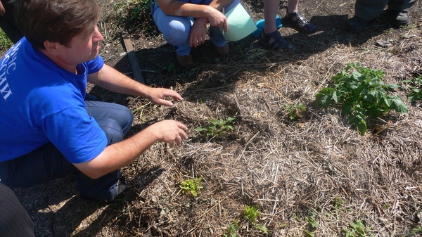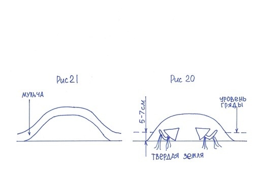 После того, как грядка посажена, накрываю ее небольшим слоем мульчи – не более 5 см (см. рис.21). После массовых всходов добавляю мульчи (у меня – солома) слоем до 30 см. На этом уход за картофелем почти заканчивается. Почти – потому, что кое–где пробьются осот и березка. Их придется прорвать вручную. Дальше – лишь уборка.