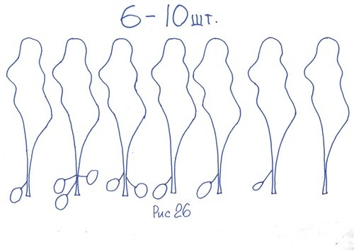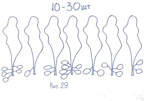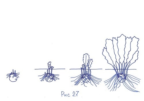 Разглядывая при уборке кусты картофеля, заметил такую закономерность: в кустах, выросших из целого клубня, на каждом растении (стволе) вырастает 1-3 клубня. В многоствольных кустах на некоторых растениях (стволах) клубней нет совсем (см. рис.26). Чаще в таком кусте 6-10 клубней.