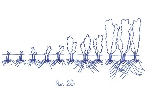 Такие же процессы происходят и при посадке части клубня. Часть «считает» себя независимым клубнем. Разница в том, что ростков на ней немного. И в молодом возрасте они испытывают гораздо меньшую конкуренцию. А значит, закладывают больше столонов – готовы дать больше клубней. Можно составить куст из отдельных кусков (см. рис.28).