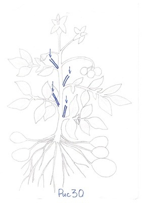 Кроме конкурентной борьбы внутри куста растения из частей клубня обладают еще одним преимуществом. Они имеют больше листьев. А значит, все растение получает больше продуктов фотосинтеза – увеличивается урожай. Увеличение листовой поверхности происходит за счет того, что в пазухах листьев появляются «пасынки» – дополнительные стволы. Такое растение выглядит не как ствол с листьями, а как маленькое деревце. На рисунке 30 стрелками показаны пасынки.