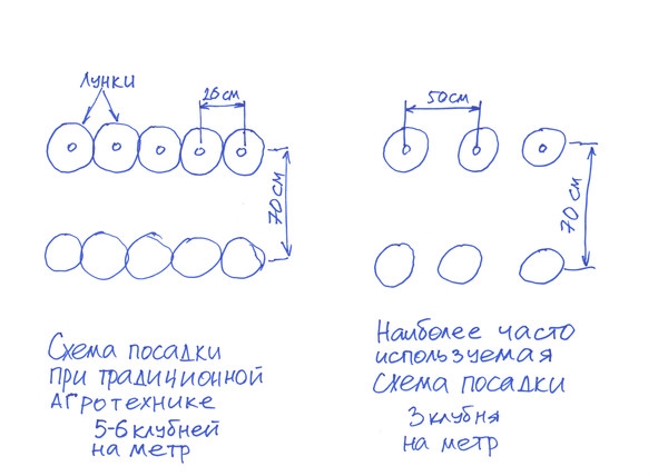 Вариант 3. На семенном участке, для размножения новых (для меня) и ценных сортов использую другую схему (см. рис.16). В каждое гнездо кладу куски с 2-3 развитыми ростками.