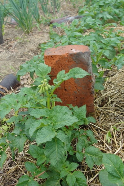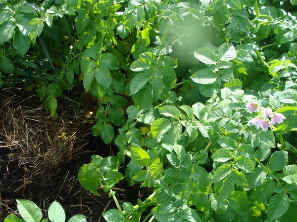 В это время картофель уже начинает цвести. Теперь уже холмики играют несколько другую роль. Они облегчают уборку. Происходит вот что. Столоны в рыхлой почве образуются в основном короткие, а нарастающие клубни выпирают из холмиков. Если не использовать толстый слой мульчи, то они легко озеленяются. Этот прием позволяет проследить за развитием клубней и когда появятся клубни товарного размера постепенно выбирать их, не выкапывая куст.