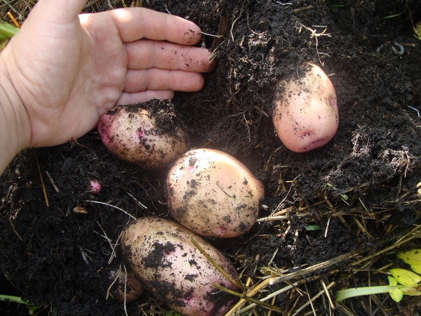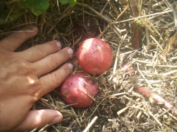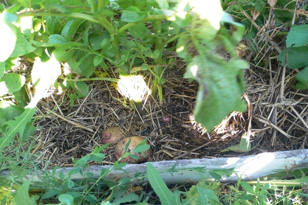 Остальные клубни куста продолжают нарастать. Вынужден признать, что холмики не позволяют обнаружить 100% всех крупных клубней. Некоторые столоны забираются в почву по ходам червей, и клубни образуются ниже рыхлого слоя. Такие клубни иногда можно обнаружить по трещинам на почве. Если же почва гряды рыхлая, то все еще проще. Заглубляем один палец в нескольких местах вокруг куста. Если обнаруживаем клубень, то аккуратно выворачиваем его, стараясь не повредить корни. После того, как крупные клубни выбраны, мульчу возвращаем на место. Следует учитывать сортовые особенности. Например, сорта Алена, Латона формируют ранний урожай достаточно дружно. Поэтому стоит снимать товарные клубни один раз. Затем выкапывать весь куст. У других сортов (например, Жуковский ранний) клубни можно снимать несколько раз, у них клубнеобразование растянуто. Нужно просто понаблюдать за теми сортами, что у вас есть.
