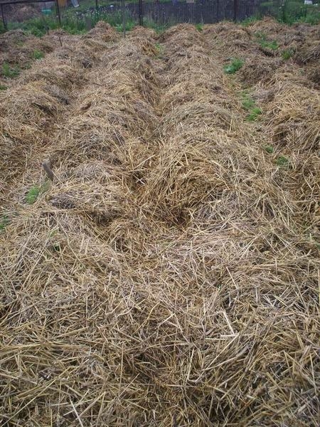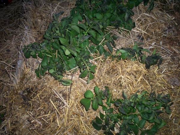 Небольшие ростки появившиеся после окучиваний, можно присыпать соломой. И отгребать после не обязательно. После окончания периода возможных заморозков картофель сам поднимется над соломой, которая теперь уже из защитного материала переквалифицируется в мульчирующий.
