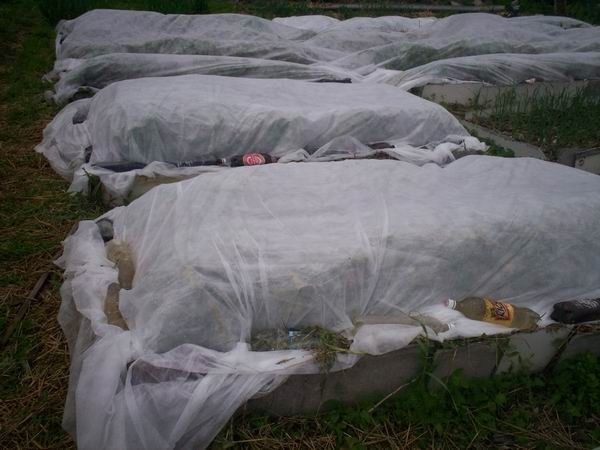 В литературе обычно рекомендуется засыпать всходы землей, когда есть угроза заморозков. Но не всегда есть возможность реагировать оперативно. Поэтому приходится засыпать всходы каждый раз, как они появляются на поверхности. Аккуратно выполняешь рекомендацию, присыпаешь всходы землей, а они через 3-4 дня опять уже над землей. Где же набрать столько земли для окучивания, если ростки упорно раз за разом рвутся наружу? Вот и приходится пользоваться разными подручными способами. Можно применить нетканый материал. Но он стоит не дешево, и на большую площадь покупать накладно.