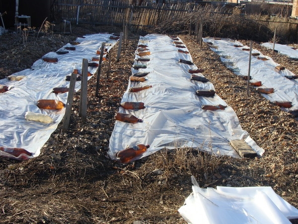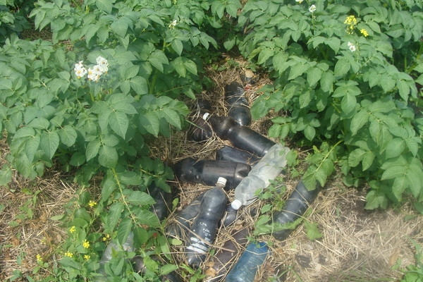 Теперь мульча уже не мешает – земля прогрелась, а вот сохранить влагу помогает. Помещаем на гряды «бутылочные термостабилизаторы» и накрываем нетканым материалом. По моим наблюдениям оптимален агротекс 40 (или другой материал с такой же плотностью) (см. «Заморозок, варианты спасения»). Нетканку удобно прижимать теми же пластиковыми бутылками, наполненными водой. Дуги не используем, растения сами поднимают тонкий материал. Нужно только оставлять припуск материала, учитывая, что стебли наращивают рост. «Термостабилизаторы» после окончания периода заморозков лучше не убирать. Они и в это время принесут пользу. Для поспевания картофелю нужна определенная сумма положительных температур. И чем раньше она будет набрана (в рамках оптимальных температур), тем быстрей картофель поспеет. В начале вегетации раннего картофеля дневные температуры ещё не слишком высоки, а ночью холодно. Эти ночные температуры задерживают развитие. «Термостабилизаторы» нагреваясь днем, ночью отдают тепло. Тем самым ускоряя развитие картофеля. В качестве термостабилизаторов можно использовать не только бутылки но и камни.