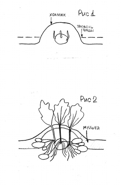 Фото сделано для наглядности расположения клубней на грядке. В реальности посадка ведется так: Делаем рукой лунку до твердой земли, опускаем туда клубень. Затем делаем лунку для следующего клубня, а землю перемещаем на посаженный клубень. При этом нагребаем над клубнем холмик высотой 5-7 см. Причем делаем холмик компактным (рис. 1).