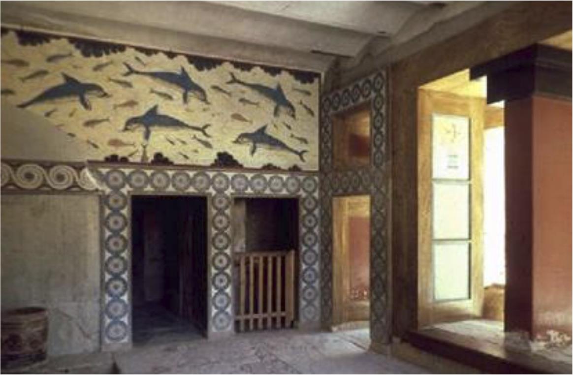 Архитектура этого критского дворца, как и других, была в высшей степени необычна, своеобразна и ни на что не похожа. Здесь имелись водопровод и канализация, хорошо продуманная система вентиляции и освещения. Стены дворца в Кноссе украшали великолепные безмятежные и жизнерадостные фрески, отличавшиеся разнообразной цветовой гаммой и исключительным искусством в передаче движения людей и животных. Они не содержали жестоких кровавых сцен войны и охоты, столь популярных в современном им искусстве стран Ближнего Востока и материковой Греции. Археологов поразил факт отсутствия укреплений дворцов, его обитатели чувствовали себя в полной безопасности. Ни одной значительной морской державы рядом тогда не существовало.