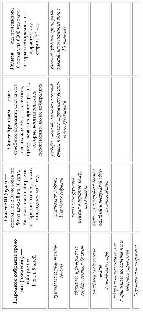 Афины сложились как торгово-ремесленный полис, где утвердилась демократия. Политическое устройство Афин периода золотого века афинской демократии (середина V – середина IV вв. до н.э.) можно представить в виде таблицы 2.