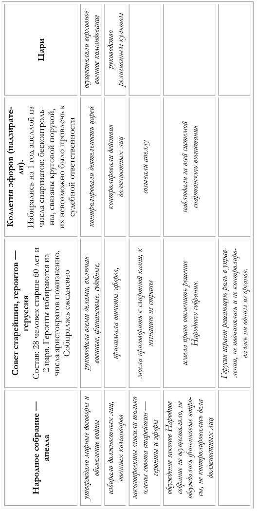 Законы легендарного Ликурга способствовали превращению Спарты в единый военный лагерь. Спартанское государство осуществляло принцип равенства и жесткой регламентации жизни спартанцев, принимало меры против имущественного расслоения спартанского общества. Так, взрослые спартанцы обязаны были посещать совместные трапезы – сисситий, а мальчики с 7 лет воспитывались в специальных лагерях-агелах. Большой властью обладала коллегия надзирателей-эфоров, наблюдавшая за соблюдением законов и должностных обязанностей, норм воспитания.