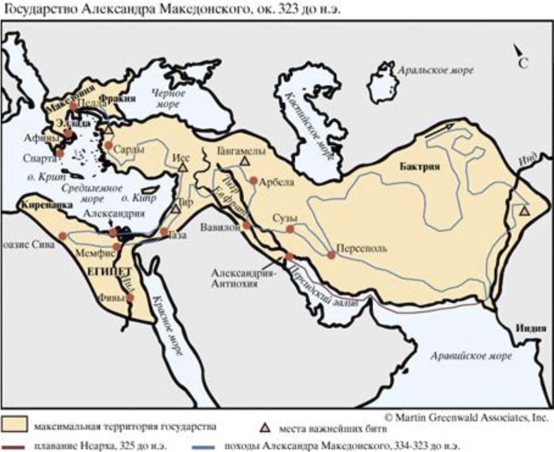 Благодаря завоеваниям Александра Македонского была создана гигантская империя, включавшая в себя помимо Балканского полуострова и островов Эгейского моря Египет, Малую Азию, юг Средней и часть Центральной Азии. Походы великого полководца несли одновременно и разрушение и созидание. На Восток хлынули потоки греческих и македонских поселенцев, которые повсеместно устанавливали новые социальные отношения, основывали города-полисы, прокладывали пути сообщения и распространяли культуру греческого мира, в свою очередь, вбирая достижения древнейших цивилизаций. Так возникло своеобразное общество и культура, представлявшее синтез элементов древнегреческой и древневосточной цивилизаций.