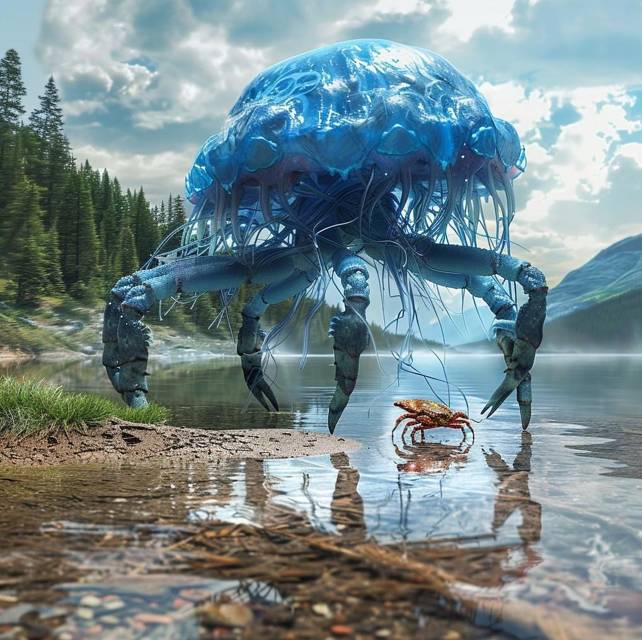 Медуза высотой со взрослого мужчину, выбралась из озера, волоча за собой обмотанного тонкими щупальцами уже мертвого Краплакса. Красный панцирь не смог выдержать сжатия щупалец и лопнул. Оказавшись на берегу, Пелагин быстро подтянул жертву к себе и наплыл на нее телом.