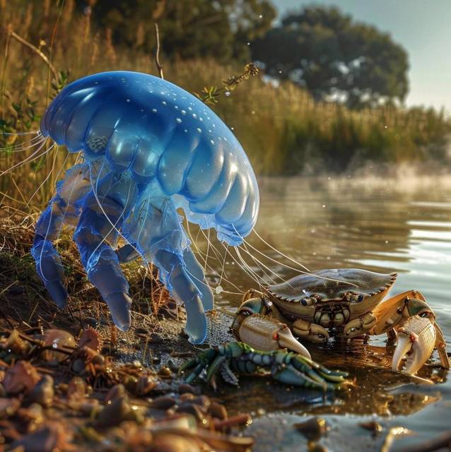 Из воды один за другим начали появляться вершины желеподобных шапок. Пелагины не спеша выбирались на сушу, волоча за собой добычу. У ближайшего было сразу два небольших Краплаксов, еще пытавшихся сопротивляться охотнику своими клешнями. За ним выбрался еще один Пелагин, волочивший крупную рыбу.