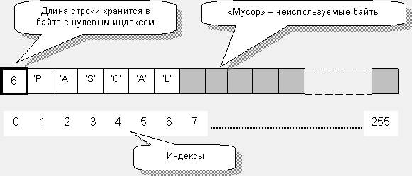 Здесь показана внутренность строковой переменной со словом «PASCAL». Байты с 1-го по 6-й содержат буквы этого слова, а остальные байты не заняты. Но в начале массива обнаружен ещё один байт – с нулевым индексом. Он содержит число 6 – это длина слова «PASCAL». Значит, строковый тип – это массив со скрытым нулевым байтом, хранящим фактическую длину строки (эту длину возвращает функция Length).