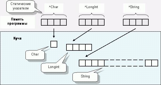 Доступ к динамическим переменным возможен лишь через указатели, а они размещаются в секции данных или в стеке. Такие переменные (в обычном понимании, то есть с именами) называют статическими, поскольку их положение в памяти не изменяется, то есть, статично. В приведенных выше примерах статические указатели ссылались на динамические переменные.