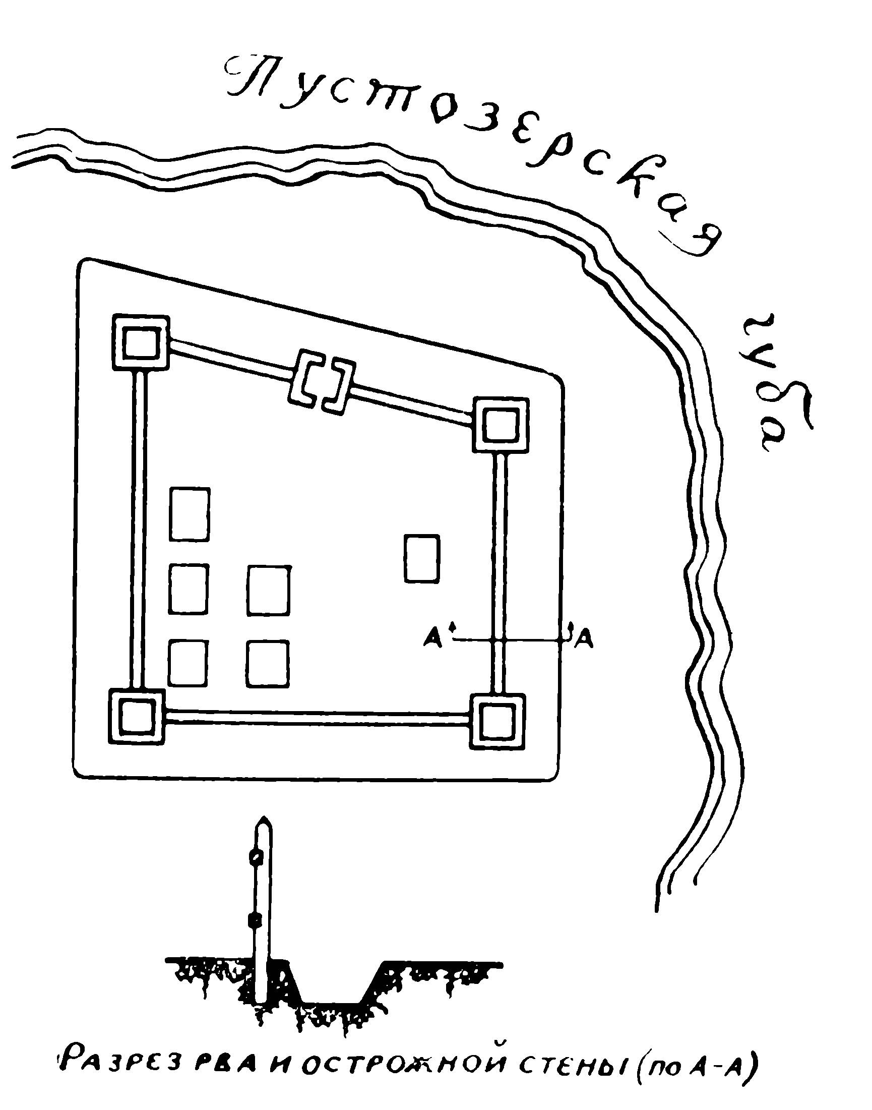 Остатки пустозерских укреплений, относящихся, по всей видимости, к XVIII в., довольно хорошо просматривались еще во второй половине XIX в. в 2 верстах от с. Пустозерского, вблизи Шароозера и протоки Гнилки на невысоком мысу. С северной и восточной сторон сохранились рвы и валы. По этим данным трудно, однако, представить характер сохранившихся укреплений. Графических материалов по пустозерским укреплениям сохранилось немного: это план Пустозерского острога XVII в., опубликованный Ф. Ласковоким, и план, снятый иностранцем Витсенем (XVI в.) .