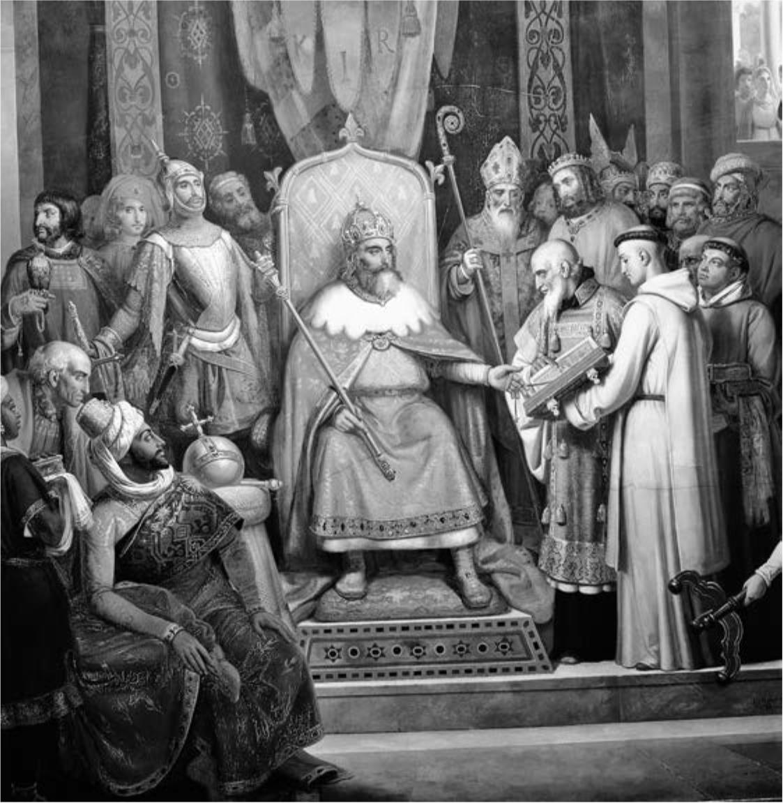Наибольшего могущества Франкское государство достигло при Карле Великом (правил в 768 – 814), одном из самых уважаемых монархов средневековой Европы. Всю жизнь Карл провёл в войнах и снискал славу непобедимого полководца. Ему удалось значительно расширить границы государства, включив в него земли Италии, северо-востока Испании, подчинить непокорные племена саксов. Логичным итогом завоевательной политики Карла стало воссоздание империи – эта идея поддерживалась церковью, выступавшей за единство христианского мира. В 800 г. во время рождественской службы в соборе Святого Петра в Риме папа римский надел на голову Карла корону и объявил его императором римлян. Вскоре Византия, считавшая себя единственной законной наследницей Рима, была вынуждена признать нового императора.