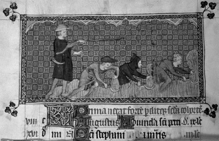 Феодал, отдающий приказания своим крестьянам. Средневековая миниатюра