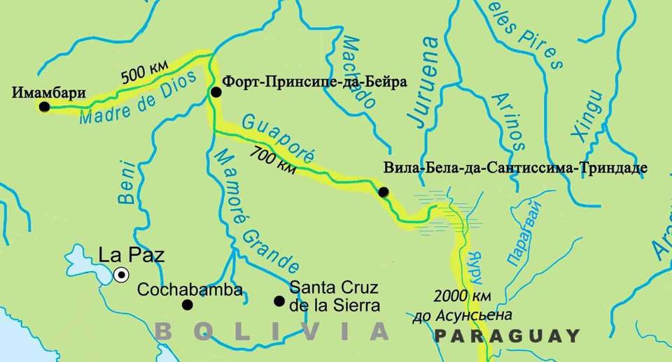 Первый, сравнительно лёгкий участок начинался от фактории и тянулся около 500 км вниз по течению реки Мадре-де-Диос до места её впадения в реку Гуапоре. Второй начинался сразу после поворота и на протяжении почти тысячи километров шёл строго против течения Гуапоре. Вплоть до её истока в гигантском болоте Пантанал.