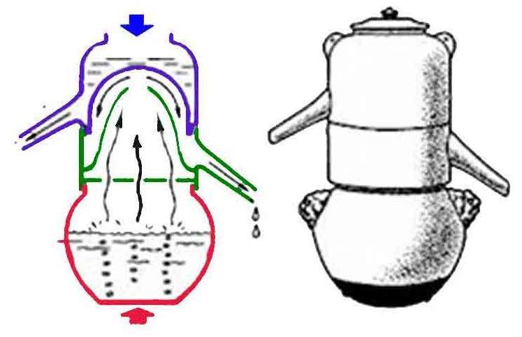 Источником вдохновения для Солано послужил древний японский самогонный аппарат «Ранбики». Его прелесть была в том, что он был чисто керамическим и очень простым в изготовлении. «Ранбики» состоит из трёх частей. Нижняя – это всего лишь горшок с сырьём. Верхняя – это сосуд для проточной воды с сильно вогнутым дном, образующим купол над горшком с сырьём. А промежуточный сосуд служит для сбора спирта, стекающего по куполу.