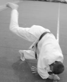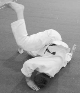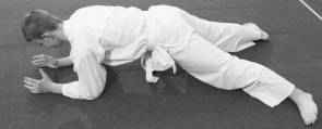 Согнув колени, сесть на ковер как можно ближе к пяткам, вытянуть руки вперед, прижать подбородок к груди. Не изменяя положения рук, ног и головы, сделать перекат на согнутой спине и, коснувшись лопатками ковра, резким движением рук вниз – назад – в стороны, ударив ими по ковру, остановить перекат. В момент удара о ковер руки должны быть вытянуты и немного разведены в стороны так, чтобы между туловищем и каждой рукой образовался угол в 45–50°. Пальцы соединены, ладони прижаты к ковру, ноги согнуты, таз приподнят над ковром.
