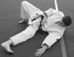 При падении на левый бок встать возле левого бока партнера, а правой рукой захватить его одежду на правом плече.