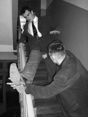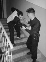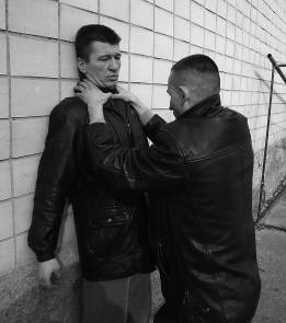 Все эти моменты происходят вследствие резкого толчка двери тем, кто стоит изнутри, на того, кто стоит снаружи и пытается потянуть дверную ручку на себя. Причем изнутри не обязательно будет находиться злоумышленник. Эту роль могут сыграть и подвыпившие подростки, и просто спешащая из дома в магазин дама. Если дверь открывается внутрь, то вследствие резкого рывка изнутри могут быть травмированы связки запястья, плеча и даже шейные позвонки. Основной принцип открывания двери заключается в проведении этого действия максимально большей плоскостью тела. То есть к ручке тянутся не уязвимые пальцы, а ребро ладони. При необходимости тихого проникновения в подъезд дверь следует прижать рукой и ногой и попытаться подать вверх. Если ручка имеет поворотный механизм, то вращать ее следует плавно и медленно. Это делается для уменьшения звука (шумового фона, демаскирующего шума). Если вас попытаются сбить с ног толчком двери, будут ломиться из подъезда, то можно свободно выдерживать напор 3–4 человек, правильно расположив тело. Больше четырех человек одновременно не сможет толкать дверь из-за недостатка места. При этом впереди стоящая (ведущая) рука прижимается к двери ладонью, предплечьем и плечом, вторая рука уперта в дверь ладонью, ведущая нога прислонена ребром стопы к двери, сзади стоящая нога выпрямлена в коленном суставе и передает все усилия атакующих в землю. Давить необходимо как можно дальше от дверных петель, ближе к противоположному краю. Тогда по закону рычагов ваши усилия возрастают многократно.