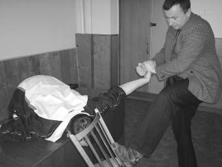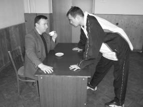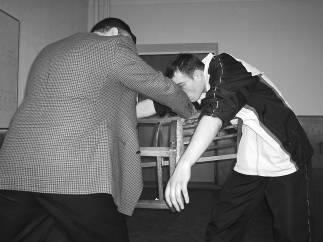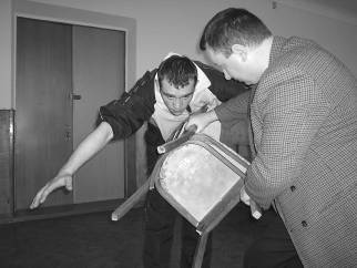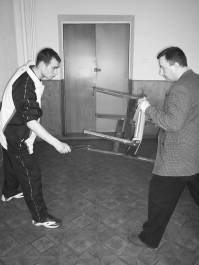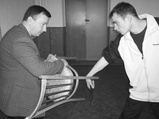 Не следует забывать и о применении боевых приемов с табуретом или стулом в руках. Используя ножки мебели в качестве своеобразной ловушки, можно эффективно опрокинуть нападающего. Техника такого рода применима на нескольких уровнях: нижнем, среднем или верхнем.