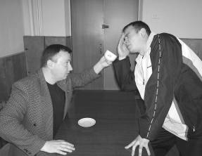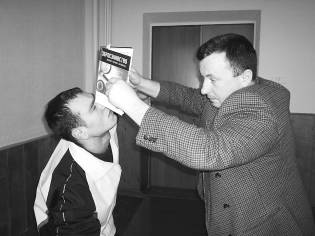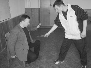 Такое же эффективное движение может быть проведено обычной книгой. Его легко неожиданно применить, вставая из положения сидя и используя обе руки в тот момент, когда противник пытается достать свое оружие.
