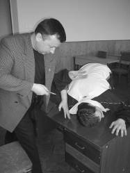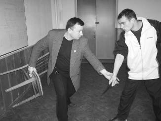 Тренируя выполнение приемов в такой ситуации, не следует забывать и о теле противника. Используя местность, можно, зафиксировав одним из изученных приемов его вооруженную руку, бросить или толкнуть его так, чтобы он ударился о твердый предмет лицом или головой. Особенно эффективно приемы такого рода применяются в случае, когда противник атакует человека, стоящего спиной к стене. Смещение с линии атаки и использование инерции его движения облегчают выполнение техники.