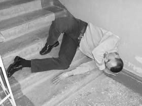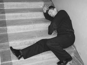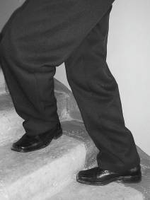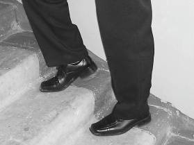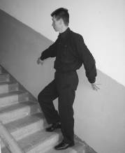Как и спуск, подъем по ступенькам является причиной множества пьяных (и трезвых) травм голеностопа, черепной коробки и позвоночного столба. Все эти травмы происходят по причине соскальзывания ноги со ступеньки и удара о выступающие элементы обстановки (перила лестницы, ребро ступени, мусоропровод и т. п.). В ситуации силового конфликта вероятность получения таких повреждений возрастает многократно. Для того чтобы принять наиболее устойчивое положение тела при движении по лестничному проему вверх или вниз, а при потере равновесия упасть наиболее мягко и безопасно, измените привычную постановку стопы. Неподготовленный человек, когда шагает по лестнице, ставит стопу на самый край ступеньки и носком вперед по ходу движения. Это очень удобно, но неправильно. Нужно ставить ногу носком под 45 градусов к линии своего движения и как можно глубже на ступеньку. Это дает прочную позицию, устойчивость при толчках, при падении тело развернется спиной под углом или параллельно к острой грани ступени.