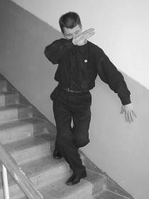 Если вы благополучно пересекли дверной короб, то это не означает, что дальше все будет так же хорошо. Бандиты могут ждать вас «в глубине пещеры». Как только вы закрыли за собой дверь на улицу, особенности темного подъезда начали работать и на вас – вы сделали свою фигуру менее заметной. Для того чтобы усилить преимущество, уйдите с линии огня, т. е. со средней линии коридора, прижмитесь спиной к стене. Передняя (ведущая) рука зондирует пространство слегка согнутыми пальцами, описывая круговые или восьмеркообразные движения. Ноги тоже слегка согнуты, передняя разгружена от веса и опирается на носок.