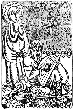 Много лет прошло с тех пор над Славянщиной. Пускались в путь далекий, в дорогу бесконечную Боян и его спутник Диводар. Посетили они поселки верховинские, племена лужанские, городища хорватские, царства дакские, гостеприимное жилье иракское. Везде были рады люди путешествующим певцам. Звучали благозвучные струны и на свадьбах, и на тризнах унылых, и на шумных праздниках купальских. Не трогали слепцов даже разбойники горные, свирепые кочевники восточные, что иногда, словно безжалостная рогатина, пронизывали земли славянские из края в край, помечая огнем и кровью свой бездумно-жестокий путь.