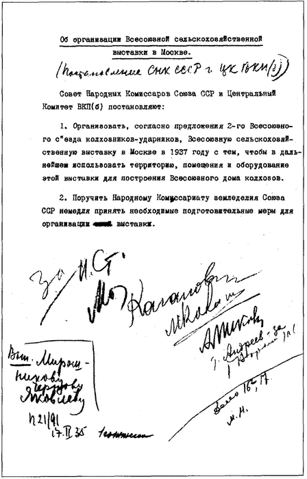 Постановление Совета народных комиссаров СССР и Центрального комитета ВКП(б) «Об организации Всесоюзной сельскохозяйственной выставки в Москве». 1935 г.