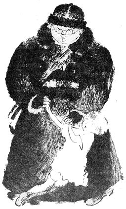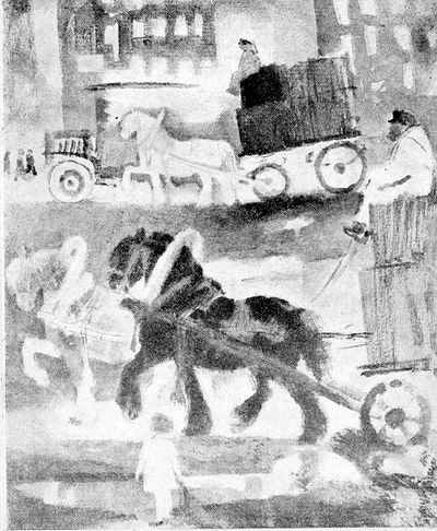 Первый раз была она на большой улице. А на улице – стук, гром, треск: лошади едут большие, мохнатые, на телегах ящики, на ящиках извозчики, дома до самого неба, трамваи так и мелькают, искры сверху сыплются. Идёт Майка, озирается, всем под ноги попадается. Вдруг на Майку мотор, Майка в сторону. А на неё лошадь, Майка в другую… а на неё другой мотор. Тут Майка зажмурилась и побежала через улицу.