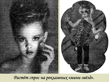 Появлению мещан, для которых главной жизненной целью является только собственное благополучие, безусловно, способствует насаждение идеала личного успеха. В этом капитализм видит и один из основных способов локализации энергии американок в рамках частной, узкоэгоистической деятельности. И это еще один социальный урок, который преподносят «звезды» своим поклонникам. Другой урок заключается в том, что карьера идола выдается за верный и надежный способ преуспевания буквально с… младенческих лет. В последние годы в США расплодились всевозможные агентства, специализирующиеся на вполне легальном использовании ребенка для рекламы товаров. Накрашенные и завитые малышки предлагают со страниц журналов и экранов телевизоров дорогие духи. С помощью детей рекламодатели пытаются создать идеальную приманку для их же сверстников. Как показали исследования, детям, проводящим утренние и вечерние часы у телевизоров, удается заставить родителей приобретать те товары, рекламой которых занимались такие же, как они, малыши.