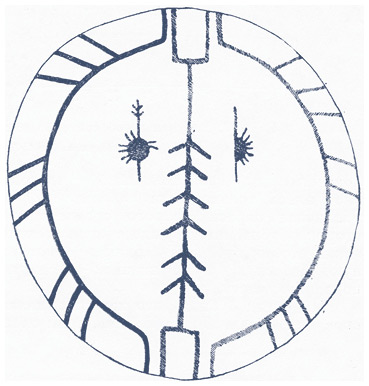 Другим воплощением мировой оси было живое существо. Так, на рисунке Фомы Пеших, о котором шла речь выше (см. выше), мы видели изображение ящерицы – родового духа-помощника шаманов: оно расположено по центру рисунка и, по сути, выполняет роль оси мира. Похожее изображение присутствует на другом селькупском бубне (см. выше), однако в данном случае перед нами дерево.