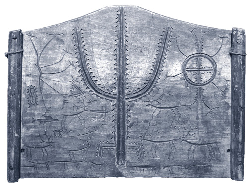 Одним из важнейших символов архаической модели мира является священная вертикаль, axis mundi – ось мира. В разных этнокультурных картинах мира она может иметь различное воплощение. В культурах Севера ось мира наиболее часто представлена в виде древа, прорастающего сквозь все миры и соединяющего их. Например, в якутском и долганском мифологическом эпосе олонхо действие происходит в трех мирах – небесном Юэхээ Дойду, земном Орто Дойду и подземном Аллараа Дойду. В центре мироздания – мировое древо Аал-луук мас, крона которого – в Верхнем мире, ствол – в Среднем, в корни уходят в темный Нижний мир. В мифах селькупов «дерево неба с почками» имеет семь ветвей на правой, солнечной, и семь ветвей на левой, ночной, стороне; на верхних ветвях сидят кукушки – священные птицы, покровительницы рождений; в дупле дерева хранятся души еще не родившихся детей, а в семи корнях живут семь змей, охраняющих дорогу в Нижний мир. В мифах народов Алтая три сферы Вселенной связывает либо дерево пай кайынг («богатая береза»), либо темир-терек («железный тополь»), на ветвях которого находятся зародыши детей и скота. Изображения мирового древа встречаются на бубнах, одежде, утвари и других предметах.