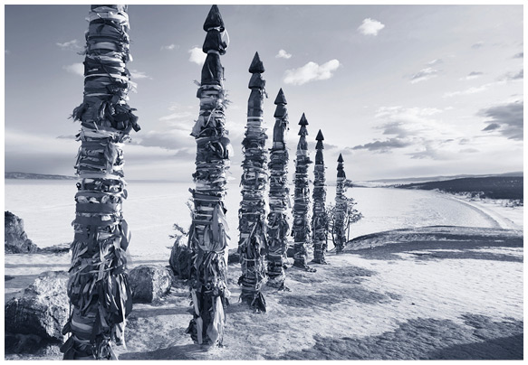 Еще одним вариантом мировой вертикали была сэргэ – ритуальная якутская коновязь. Ее украшали образами мифических зверей, приношениями из ткани. На столбе коновязи вырезали горизонтальные канавки, верхняя из которых предназначалась для коней небожителей айыы, средняя – для лошадей обычных людей, а нижняя – для коней демонов абаасы, обитателей Нижнего мира.
