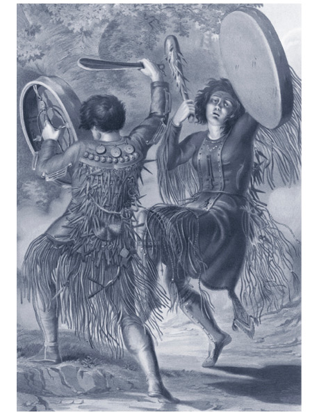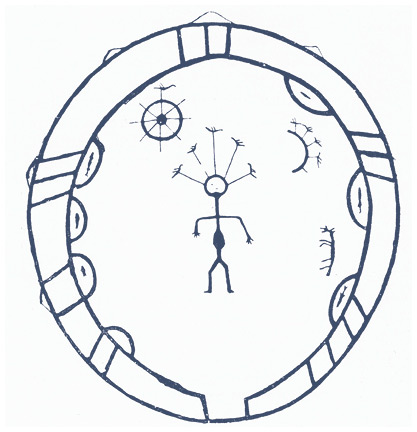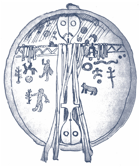 Разрисовка алтайского бубна (см. ниже) наиболее ярко передает мифологическую идею тождества макро– и микрокосмоса, природы и человека. В верхней части бубна, по сторонам от головы «мирового человека», нарисованы солнце, луна, утренняя и вечерняя Венера. Мелкие звезды в виде точек покрывают всю поверхность бубна, что придает ему масштабность мироздания. Две дуги, состоящие из пяти полос каждая, между которыми расположены точки-звезды, изображают радугу (по другим толкованиям – Млечный Путь). Поперечная линия на месте рук осмыслялась как тетива лука, а отходящие от нее вниз короткие прямые отростки – как стрелы. Ниже помещены антропоморфные фигуры взявшихся за руки и как бы пляшущих «небесных дев» – дочерей светлого небесного божества Ульгеня, которые считались помощницами шамана. Внизу слева нарисован шаман с бубном и колотушкой (на бубне, в свою очередь, тоже нанесена антропоморфная фигура, аналогичная главному изображению). Внизу справа мы видим дерево с привязанной к нему жертвенной лошадью, около нее – фигуру шамана.