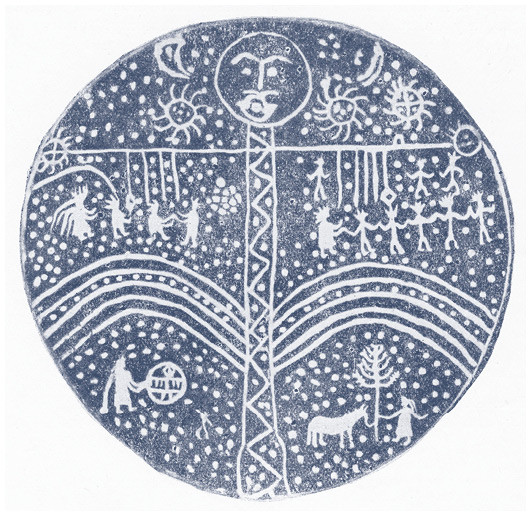 Образ «мирового человека» обычно занимает центральное место в композиции бубна: он либо нарисован на внешней стороне обтяжки, либо вырезан на вертикально расположенной рукоятке бубна.